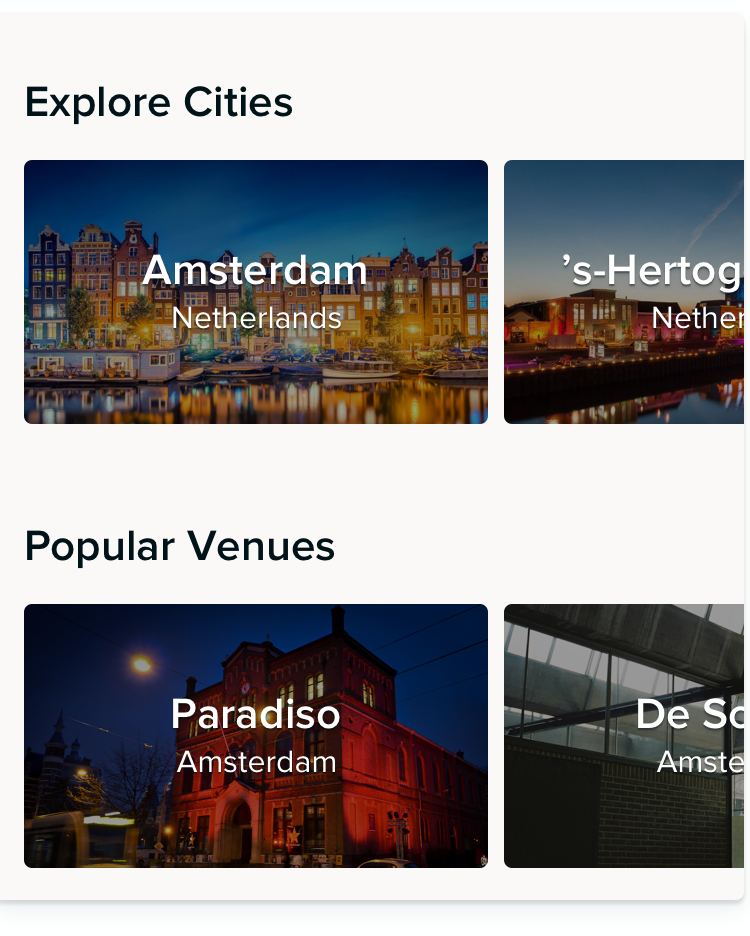 We make sure you'll find the event you are looking for. Browse through venues and cities or explore artists that perform near you